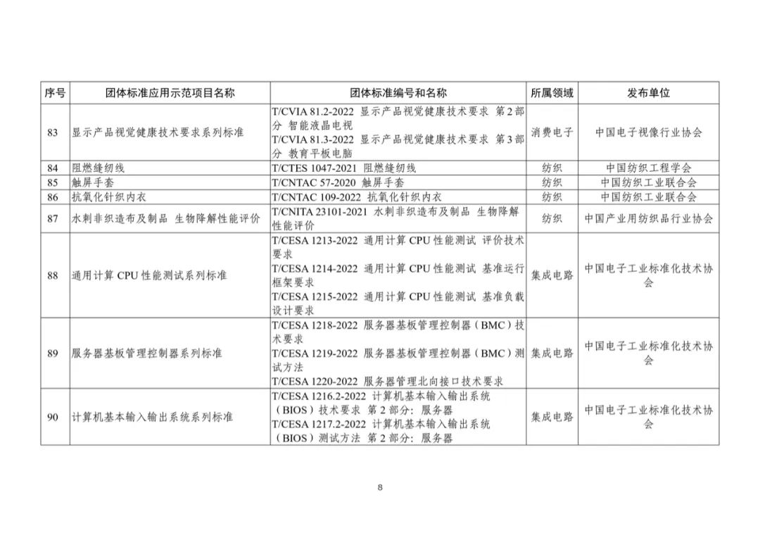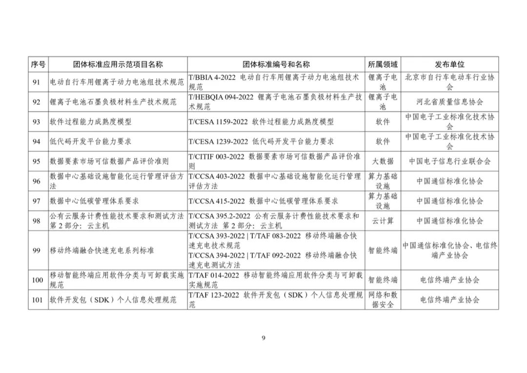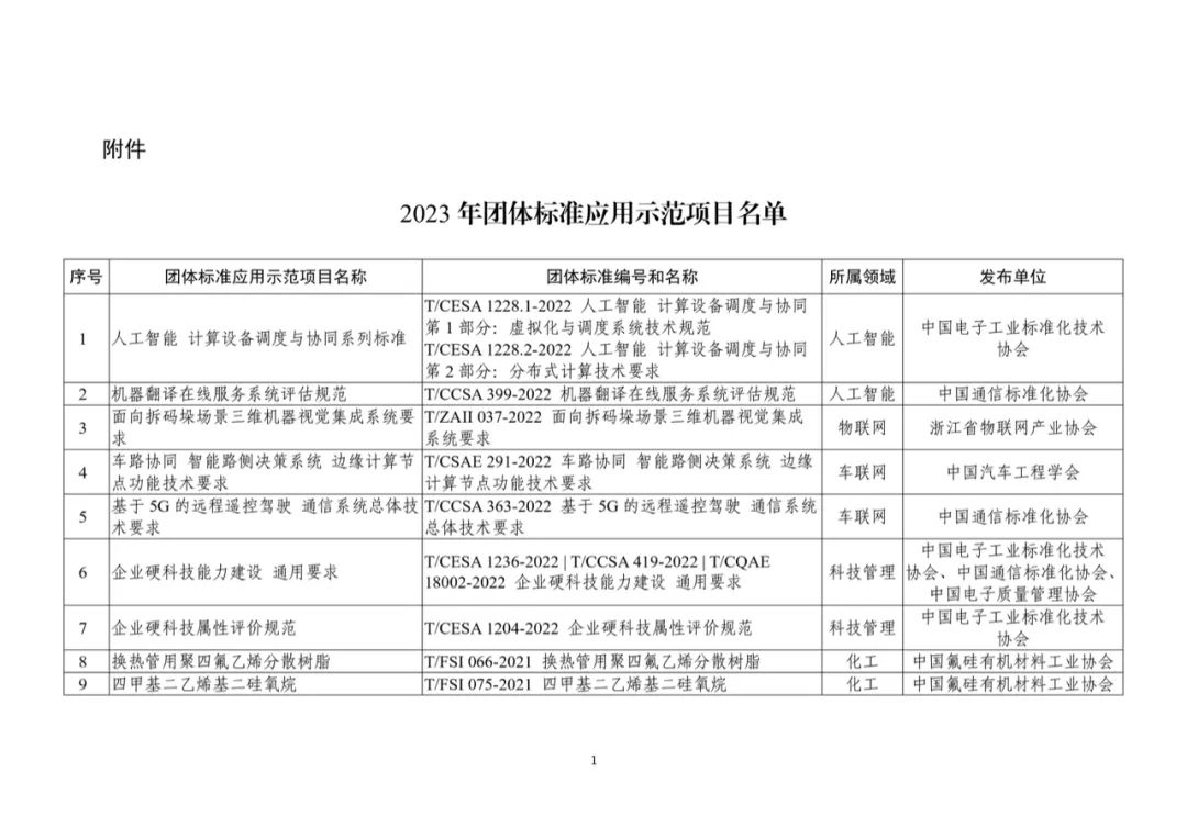 為深入貫徹落實《國家標準化發展綱要》,大力發展團體標準,推進團體標準應用示范,根據《工業和信息化部辦公廳關于開展2023年百項團體標準應用示范項目申報工作的通知》(工信廳科函〔2023〕165號)要求,經自愿申報、地方或行業推薦、專家審查和社會公示等環節,我部遴選出109項2023年團體標準應用示范項目(名單見附件),現予以公布。