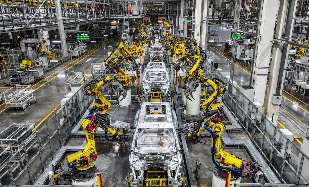 位于重慶市兩江新區(qū)的賽力斯汽車超級(jí)工廠拍攝的自動(dòng)化生產(chǎn)作業(yè)現(xiàn)場(chǎng)。 新華社記者 王全超 攝