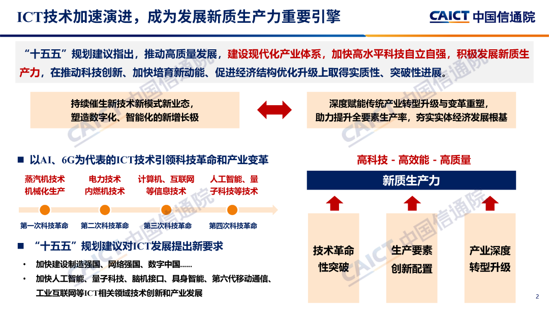 “十五五”規(guī)劃建議提出,推動高質(zhì)量發(fā)展,建設(shè)現(xiàn)代化產(chǎn)業(yè)體系,加快高水平科技自立自強,積極發(fā)展新質(zhì)生產(chǎn)力。以人工智能為代表的新一代信息通信技術(shù)正在引領(lǐng)新一輪科技革命和產(chǎn)業(yè)變革,日益成為培育發(fā)展新質(zhì)生產(chǎn)力、推進中國式現(xiàn)代化、實現(xiàn)高質(zhì)量發(fā)展的關(guān)鍵支撐。中國信通院研判認為,面向“十五五”,ICT產(chǎn)業(yè)正在進入以智能化重構(gòu)為驅(qū)動的新增長周期,人工智能技術(shù)產(chǎn)業(yè)應(yīng)用協(xié)同創(chuàng)新,將驅(qū)動通信、感知和計算等信息基礎(chǔ)設(shè)施迭代升級,推動智能終端、智能服務(wù)等軟硬件協(xié)同創(chuàng)新,促進智能安全體系變革重塑;數(shù)字化轉(zhuǎn)型向縱深推進,智能技術(shù)全面融入,推動生產(chǎn)要素創(chuàng)新性配置,深度賦能傳統(tǒng)產(chǎn)業(yè)轉(zhuǎn)型升級和變革重塑,助力提升全要素生產(chǎn)率;國內(nèi)數(shù)字治理體系建設(shè)縱深推進,中國將以更加積極主動姿態(tài)參與全球數(shù)字治理。