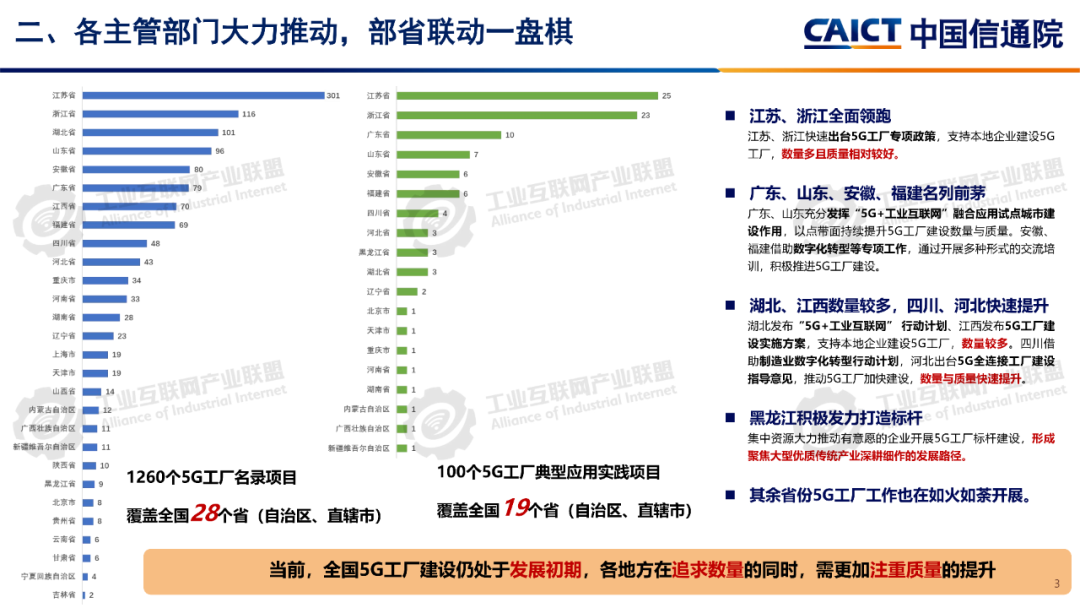 報告認為,5G工廠作為拓展“5G+工業互聯網”規模化、深層次應用的重要載體,通過理論研究、應用實踐,已進入規模發展與質量提升的新階段,在工廠內形成了依托5G網絡的生產管理新模式。近年來,工業和信息化部打造5G工廠中國品牌,探索中國特色產業數智化發展道路,依據《5G全連接工廠建設指南》要求,實施“百千萬”行動,目前全國“5G+工業互聯網項目”超過2萬個,其中1260個項目收入《5G工廠名錄》,形成了100個典型應用實踐,打造了1個五星級5G工廠,全面完成“十四五”時期工作目標。