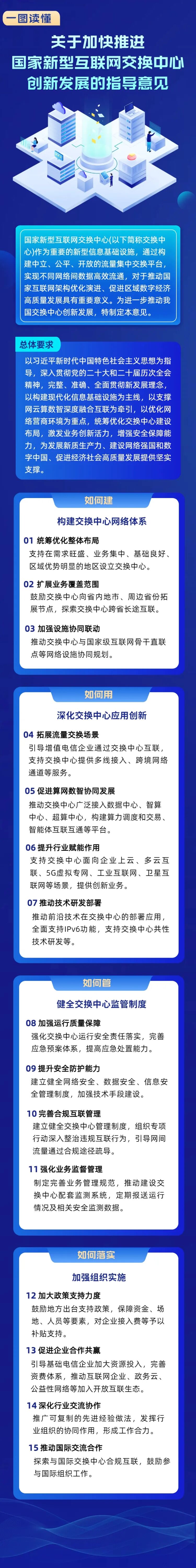 《指導意見》明確以習近平新時代中國特色社會主義思想為指導,貫徹新發展理念,以構建現代化信息基礎設施為主線,以支撐網云算數智深度融合互聯為牽引,以優化網絡營商環境為重點,統籌優化交換中心建設布局,激發業務創新活力,增強安全保障能力,為經濟社會高質量發展提供堅實支撐。