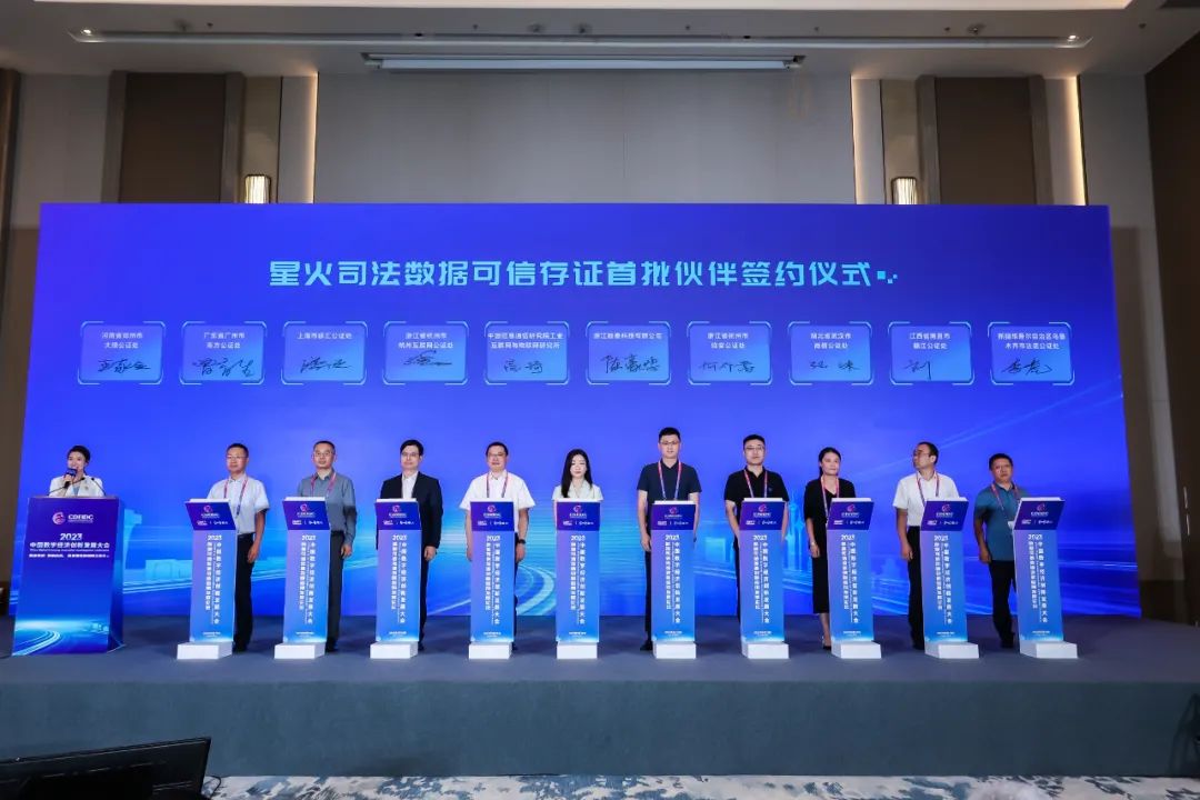 星火司法數(shù)據(jù)可信存證首批簽約儀式星火司法數(shù)據(jù)可信存證首批伙伴簽約儀式上,高琦、浙江數(shù)秦科技有限公司副總裁陳豪鳴分別與浙江省杭州市杭州互聯(lián)網(wǎng)公證處主任徐小蔚、浙江省杭州市臨安公證處主任助理何介嵩、上海市徐匯公證處主任潘浩、湖北省武漢市尚信公證處主任張沫、廣東省廣州市南方公證處副主任曾育生、江西省南昌市贛江公證處副主任劉建勇、河南省鄭州市大豫公證處副主任王家立、新疆維吾爾自治區(qū)烏魯木齊市法諾公證處主任李虎共8家單位代表進(jìn)行三方協(xié)議現(xiàn)場(chǎng)簽約,未來(lái),星火司法數(shù)據(jù)可信存證服務(wù)將積極構(gòu)建行業(yè)數(shù)據(jù)共享生態(tài),為數(shù)字空間的發(fā)展提供可信存證環(huán)境,支撐數(shù)字經(jīng)濟(jì)健康發(fā)展。