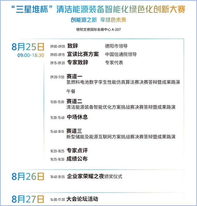 由世界清潔能源裝備大會組委會主辦,中國信息通信研究院聯合工業互聯網產業聯盟等單位共同舉辦的數境“三星堆杯”清潔能源裝備智能化綠色化創新大賽決賽暨成果路演即將于8月25日在四川德陽舉行。決賽選手們將通過演講、技術展示、產品展示等形式,向評委和觀眾展現解題思路和解決方案,接受專家評委質詢,決出大賽獲獎排名并舉行頒獎儀式。