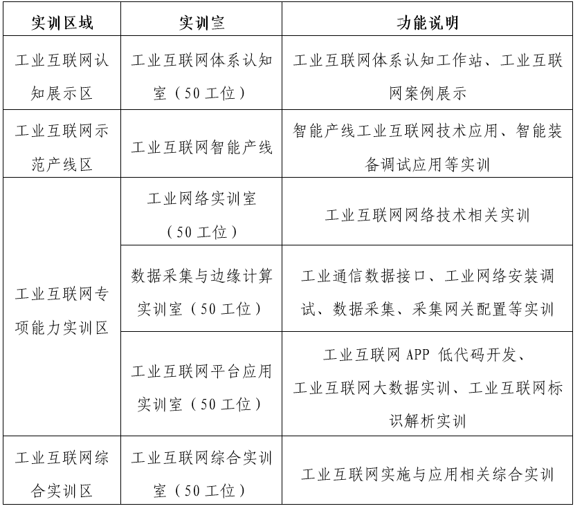 工業互聯網專項能力實訓區域:工業互聯網專項能力實訓區將規劃有工業網絡實訓室、數據采集與邊緣計算實訓室和工業互聯網平臺應用實訓室等實訓環境,基于技術領域視角,覆蓋了工業互聯網技術領域的感知控制層、網絡層、平臺層、應用層的實訓教學,能夠讓學生基本掌握工業互聯網平臺實施部署、運營維護、技術應用等專項技術應用能力。