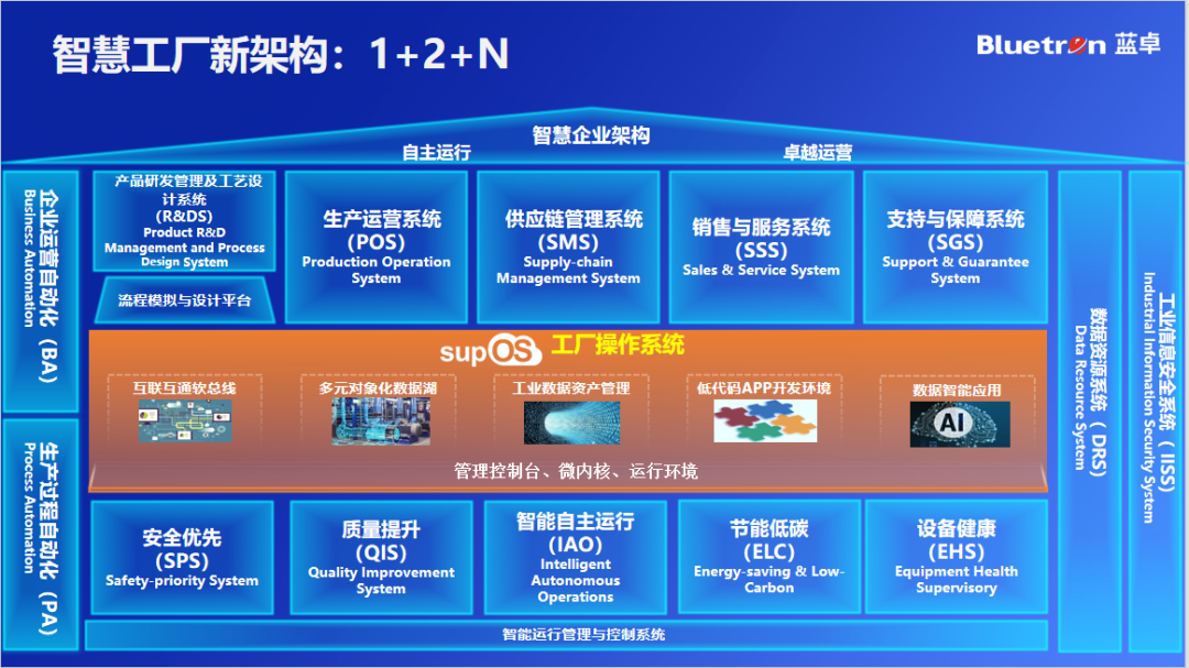 藍卓持續(xù)探索一條適合大規(guī)模、低成本推進智能制造的路徑。2023年,藍卓創(chuàng)新打造“1+2+N”的智慧工廠新架構。即1個工廠操作系統(tǒng)supOS;2個自動化,一個是生產(chǎn)過程自動化,一個是企業(yè)經(jīng)營管理自動化;以及N個工業(yè)軟件。基于supOS平臺,對企業(yè)各類數(shù)據(jù)統(tǒng)一集中管理,貫通兩個自動化,同時,基于工業(yè)APP組合應用,賦能企業(yè)數(shù)字化轉型。目前,該“中國方案”正揚帆出海,成功應用于沙特阿美、巴斯夫、Indorama、馬來西亞國家石油等海外龍頭企業(yè)。