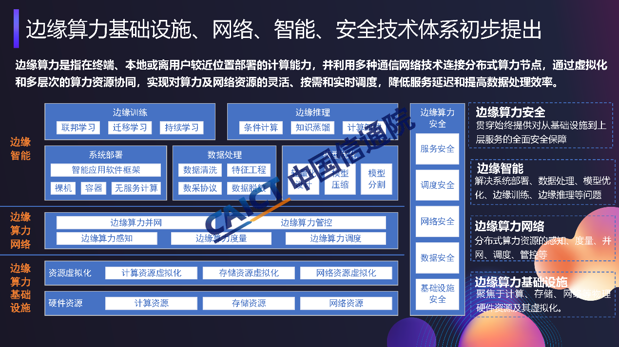 作為業界首個以邊緣算力為主題的研究報告,《邊緣算力藍皮書》系統闡述了邊緣算力整體發展態勢、關鍵特征、以及技術產業演進趨勢等內容,為推動邊緣算力應用落地提供理論支撐及實踐參考。本藍皮書分為五部分:第一章從政策、標準及產業等三個維度全面分析了邊緣算力發展態勢;第二章總結了邊緣算力概念及關鍵特征;第三章提出了邊緣算力技術體系,詳細闡述了邊緣算力基礎資源設施、邊緣算力資源邊緣算力資源調度、邊緣算力運維及邊緣算力安全等關鍵技術演進趨勢;第四章剖析了工業互聯網、智慧社區、軌道交通等垂直領域邊緣算力應用模式;第五章探討了邊緣算力未來發展方向,提出了完善標準體系、加強基礎設施建設、推動算力共享等建議。