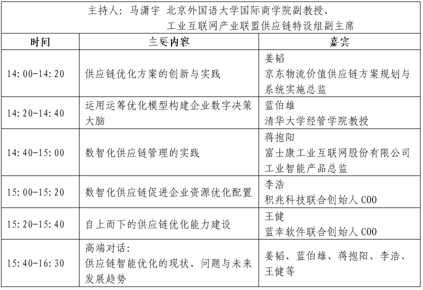 近年來,新一輪科技革命深入推進,以工業互聯網為載體,人工智能技術、運籌優化算法等深度賦能供應鏈轉型升級,實現智能優化。因此,工業互聯網產業聯盟聯合中國信息通信研究院、中國通信學會工業互聯網委員會、中國互聯網協會工業互聯網工作委員會、北京外國語大學、中國運籌學會數據科學與運籌智能分會(籌)共同舉辦“供應鏈智能優化”專題科普講座,特邀京東物流價值供應鏈方案規劃與系統實施總監姜韜、清華大學經管學院教授藍伯雄、富士康工業互聯網股份有限公司工業智能產品總監蔣抱陽、積兆科技聯合創始人COO李浩、藍幸軟件聯合創始人COO王健等大咖專家齊聚上海,分享供應鏈智能優化領域的寶貴知識和實踐經驗,助力廣大企業從數字化走向智能化。