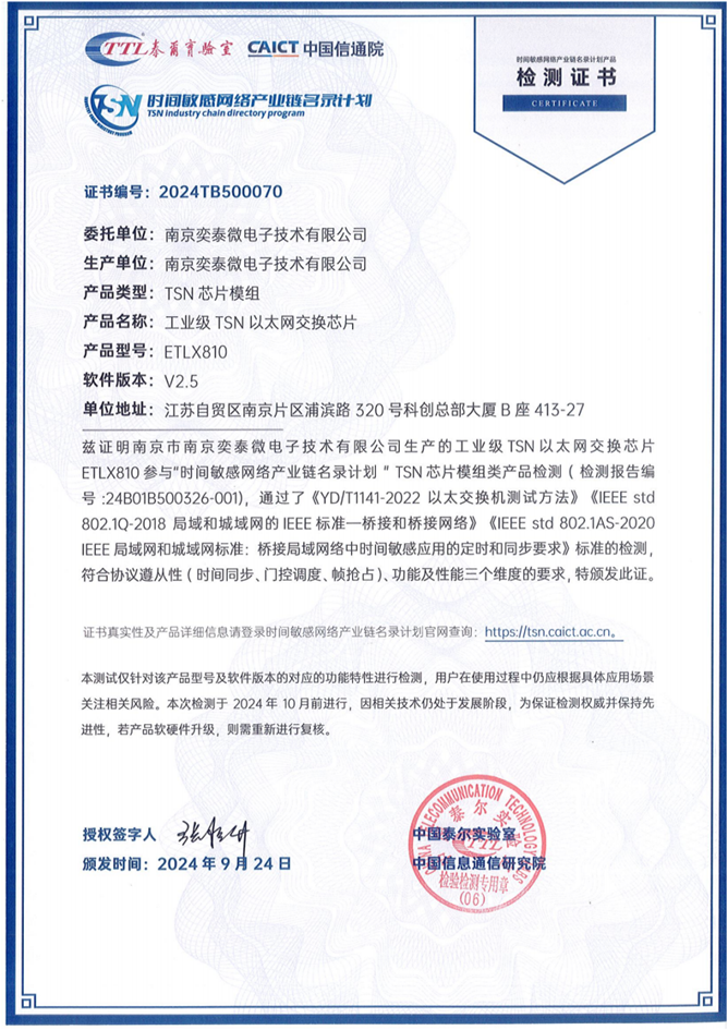 2024年9月,南京奕泰微電子技術有限公司(以下簡稱奕泰微)研發(fā)的ETL810型工業(yè)以太網(wǎng)TSN交換芯片,在互聯(lián)網(wǎng)與工業(yè)融合創(chuàng)新工信部重點實驗室順利通過名錄計劃產(chǎn)品評測,獲得芯片模組類檢測證書。