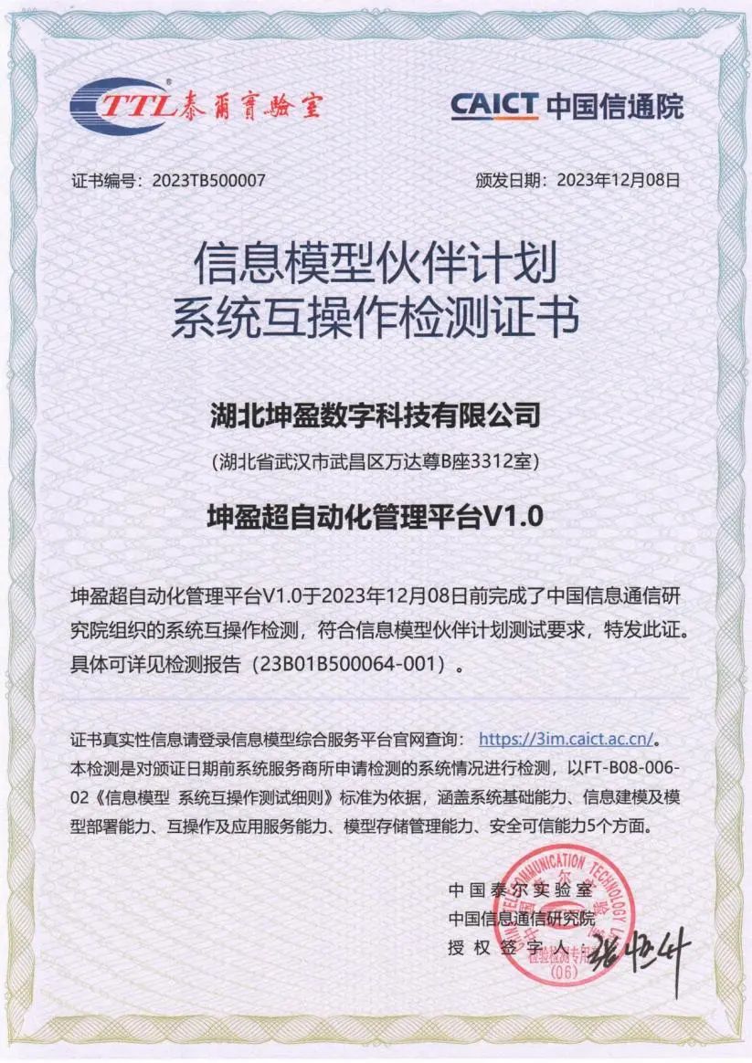 湖北坤盈數字科技有限公司(以下簡稱“坤盈數科”)是工業互聯網產業聯盟信息模型伙伴計劃伙伴單位,自主研發的坤盈超自動化管理平臺V1.0基于坤盈數科企業數字化研發底座衍生出的綜合管理平臺,該平臺完成了中國信息通信研究院組織的系統互操作檢測。