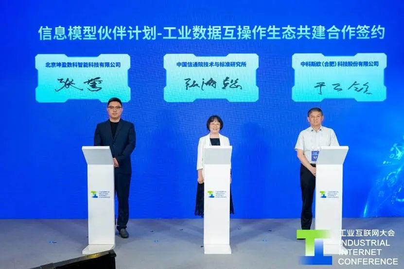 在信息模型伙伴計(jì)劃-工業(yè)數(shù)據(jù)互操作生態(tài)共建合作簽約儀式環(huán)節(jié),中國(guó)信通院技術(shù)與標(biāo)準(zhǔn)研究所所長(zhǎng)張海懿、中科斯歐(合肥)科技股份有限公司董事長(zhǎng)于萬(wàn)欽、北京坤盈數(shù)科智能科技有限公司總經(jīng)理張譽(yù)共同簽約。后續(xù),三方將在工業(yè)數(shù)據(jù)互操作領(lǐng)域深化合作,共同開展技術(shù)研究、標(biāo)準(zhǔn)編制、案例打造等工作,攜手推動(dòng)信息模型發(fā)展。