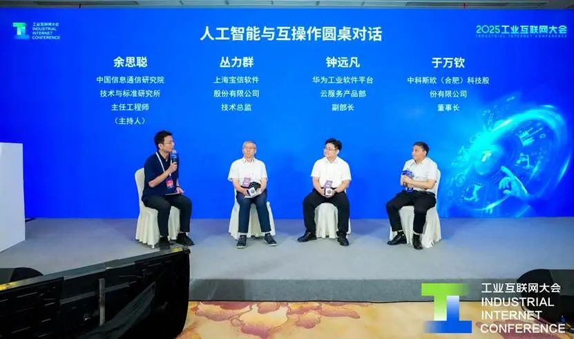 在圓桌對(duì)話環(huán)節(jié),中國(guó)信息通信研究院技術(shù)與標(biāo)準(zhǔn)研究所主任工程師余思聰、上海寶信股份有限公司技術(shù)總監(jiān)叢力群、華為工業(yè)軟件平臺(tái)云服務(wù)產(chǎn)品部副部長(zhǎng)鐘遠(yuǎn)凡、中科斯歐(合肥)科技股份有限公司董事長(zhǎng)于萬(wàn)欽就工業(yè)互聯(lián)網(wǎng)與人工智能的融合路徑、數(shù)據(jù)治理挑戰(zhàn)以及AI時(shí)代工業(yè)智能化發(fā)展策略等熱點(diǎn)話題進(jìn)行了探討。