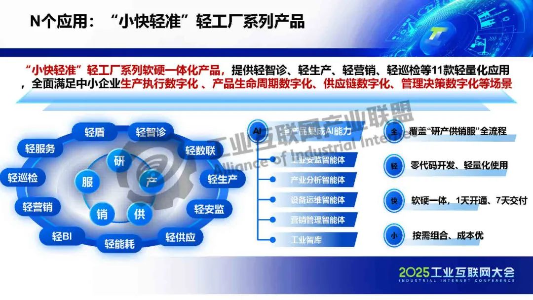 “小快輕準”輕工廠系列軟硬一體化產品,提供輕智診、輕生產、輕營銷、輕巡檢等11款輕量化應用,全面滿足中小企業生產執行數字化 、產品生命周期數字化、供應鏈數字化、管理決策數字化等場景