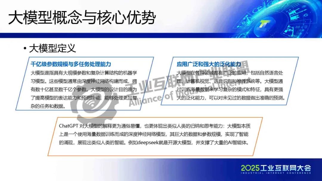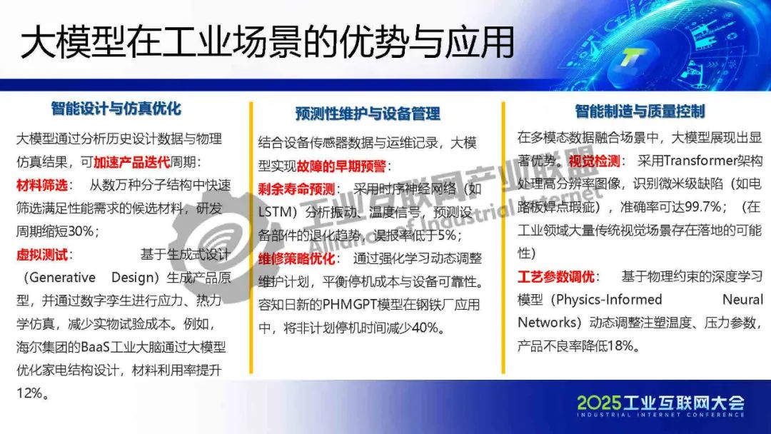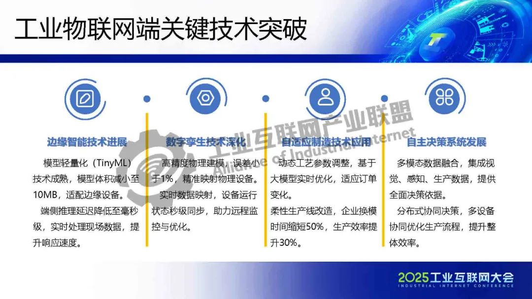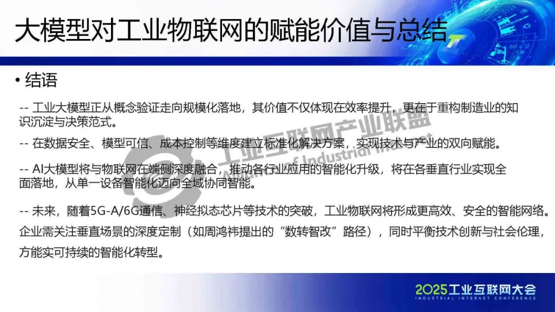 徐明介紹,工業(yè)大模型正從概念驗(yàn)證走向規(guī)模化落地,其價(jià)值不僅體現(xiàn)在效率提升,更在于重構(gòu)制造業(yè)的知識沉淀與決策范式。在數(shù)據(jù)安全、模型可信、成本控制等維度建立標(biāo)準(zhǔn)化解決方案,實(shí)現(xiàn)技術(shù)與產(chǎn)業(yè)的雙向賦能。未來,隨著5G-A/6G通信、神經(jīng)擬態(tài)芯片等技術(shù)的突破,工業(yè)物聯(lián)網(wǎng)將形成更高效、安全的智能網(wǎng)絡(luò)。企業(yè)需關(guān)注垂直場景的深度定制,同時(shí)平衡技術(shù)創(chuàng)新與社會倫理,方能實(shí)可持續(xù)的智能化轉(zhuǎn)型。