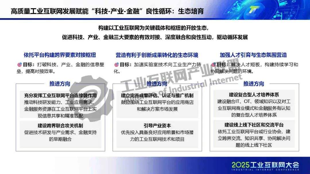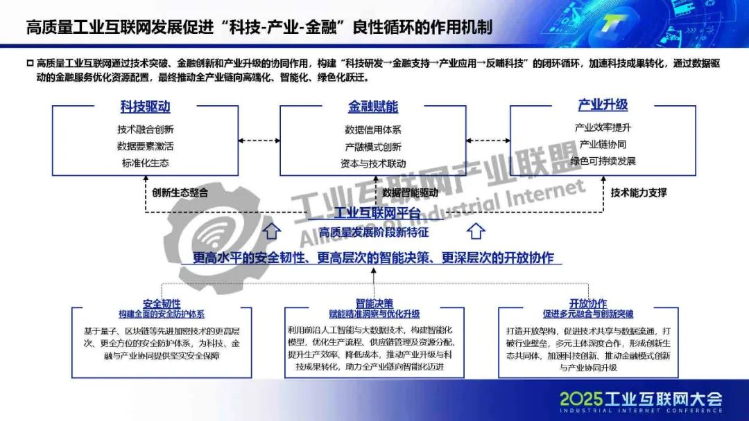 廖文凱介紹,我國工業互聯網由起步建設階段邁入高質量發展新階段,政策體系漸趨完善、技術融合應用持續深化、行業應用成效凸顯。而工業互聯網的高質量發展將進一步通過區域集群化協同與行業深度垂直化,打通科技、金融、產業的互動壁壘,構建“數據-資本-價值”三位一體的循環體系,推動實現“科技-金融-產業”良性循環。