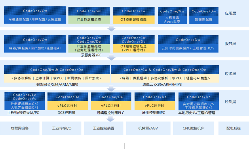 CodeOne工控軟件平臺(tái)面向不同設(shè)備廠商大/中/小型可編程邏輯控制器(PLC)和IPC提供統(tǒng)一無代碼組態(tài)編程環(huán)境、無差別編譯器與標(biāo)準(zhǔn)化運(yùn)行時(shí),軟件功能覆蓋工控系統(tǒng)的控制層、邊緣層、服務(wù)層和應(yīng)用層(見下圖),支持“數(shù)據(jù)采集-智能處理-應(yīng)用開發(fā)-反向控制”全鏈條閉環(huán)。控制層可集成軟PLC運(yùn)行時(shí)內(nèi)核,支持多種異構(gòu)PLC/IPC硬件;邊緣層可支持EtherCAT、Profibus、OPC UA、MQTT等多種協(xié)議,集成邊緣計(jì)算、斷網(wǎng)續(xù)傳、國密算法;服務(wù)層集成容器、微服務(wù)技術(shù)和輕量化大語言模型,支持大容量數(shù)據(jù)存儲(chǔ)、周期定時(shí)/事件觸發(fā)/接口交互等多種類型的復(fù)雜邏輯編排處理服務(wù);應(yīng)用層集成支持IT與OT融合的PLC無代碼組態(tài)編程工具,支持端邊云協(xié)同的運(yùn)動(dòng)控制和PLC多機(jī)集群分布式控制等多種應(yīng)用。