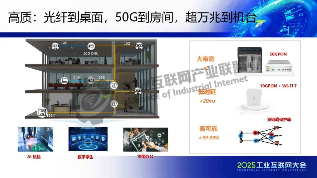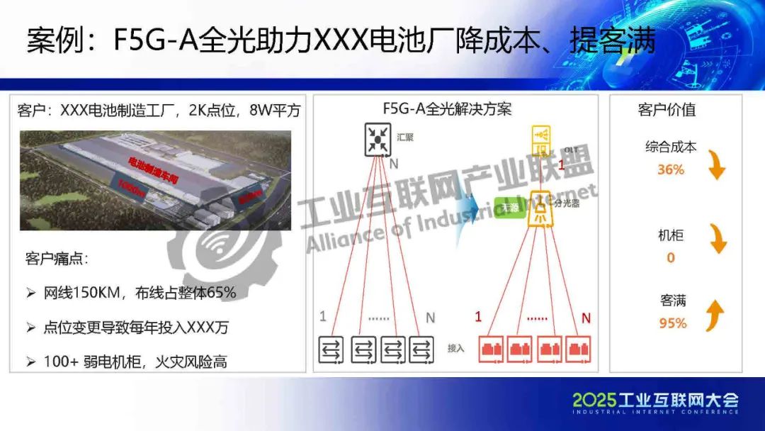 龔奎介紹,在工業(yè)園區(qū)網(wǎng)絡(luò)建設(shè)中,光進(jìn)銅退是大趨勢(shì),F(xiàn)5G-A全光園區(qū)方案因光纖介質(zhì)易獲取、無(wú)源傳輸?shù)葍?yōu)勢(shì),可實(shí)現(xiàn)綠色節(jié)能,且能更好滿(mǎn)足AI應(yīng)用對(duì)大帶寬、低時(shí)延的要求。國(guó)家政策也支持PON技術(shù)在園區(qū)應(yīng)用。華為的F5G-A園區(qū)網(wǎng)絡(luò)解決方案,具有綠色、高質(zhì)、易演進(jìn)特點(diǎn),采用光纖到機(jī)器、無(wú)源分光器等技術(shù),可節(jié)省部件成本80%以上,減少弱電機(jī)柜需求,還具備長(zhǎng)生命周期、強(qiáng)抗干擾性、相對(duì)無(wú)限帶寬等優(yōu)勢(shì),能適應(yīng)技術(shù)快速演進(jìn)。如某電池工廠(chǎng)應(yīng)用后,綜合造價(jià)成本降低30%以上,客戶(hù)滿(mǎn)意度提升。目前,已聯(lián)合各方發(fā)布F5G-A在工業(yè)園區(qū)的標(biāo)準(zhǔn),推動(dòng)產(chǎn)業(yè)發(fā)展。
