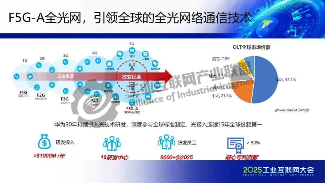 5月22日,在2025工業(yè)互聯(lián)網(wǎng)大會(huì)“工業(yè)數(shù)字化綠色化協(xié)同轉(zhuǎn)型專(zhuān)題活動(dòng)”上,華為技術(shù)有限公司政企光接入總監(jiān)龔奎發(fā)表了《F5G-A全光助力新型工業(yè)綠色高質(zhì)發(fā)展》的主題演講。