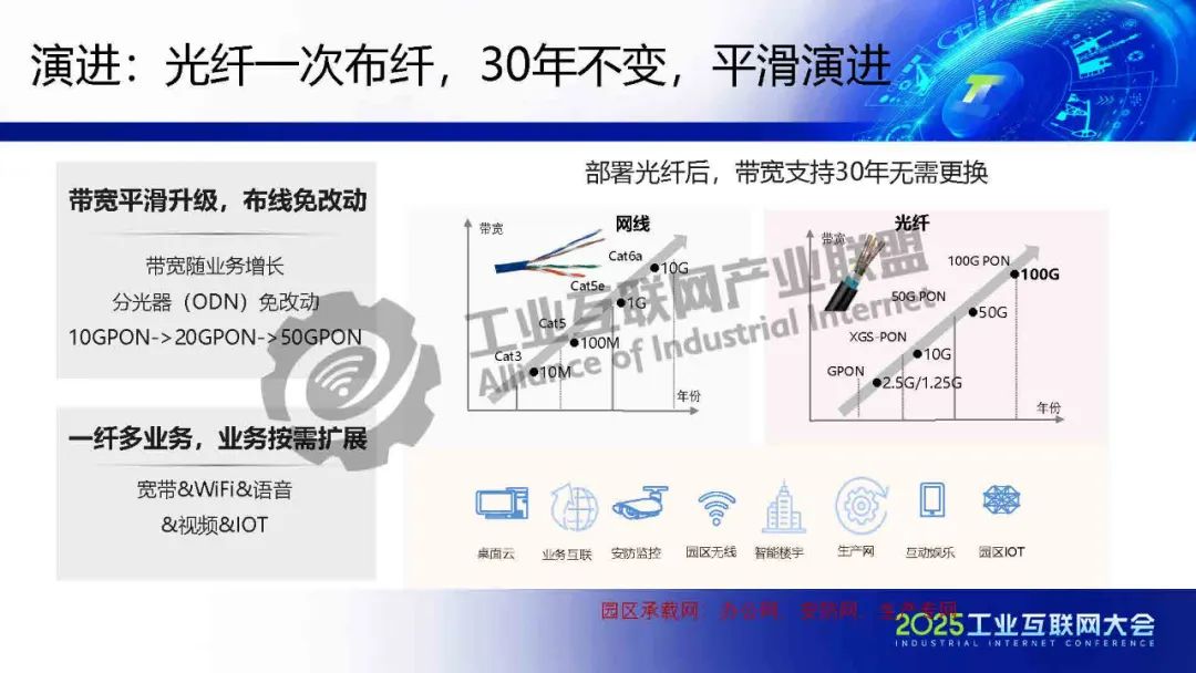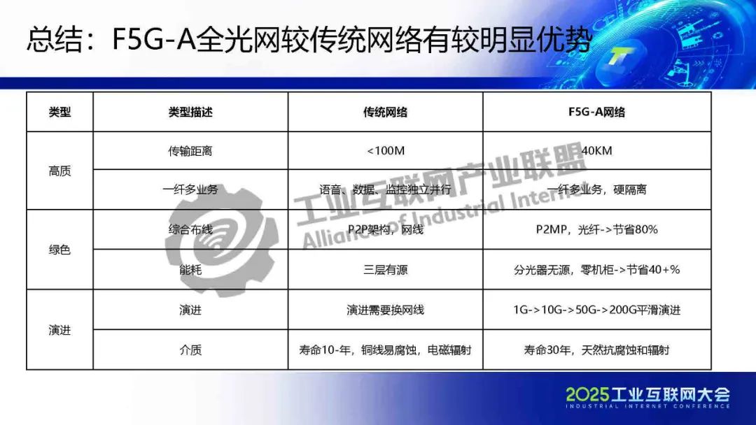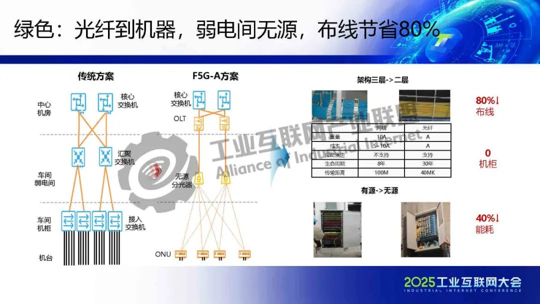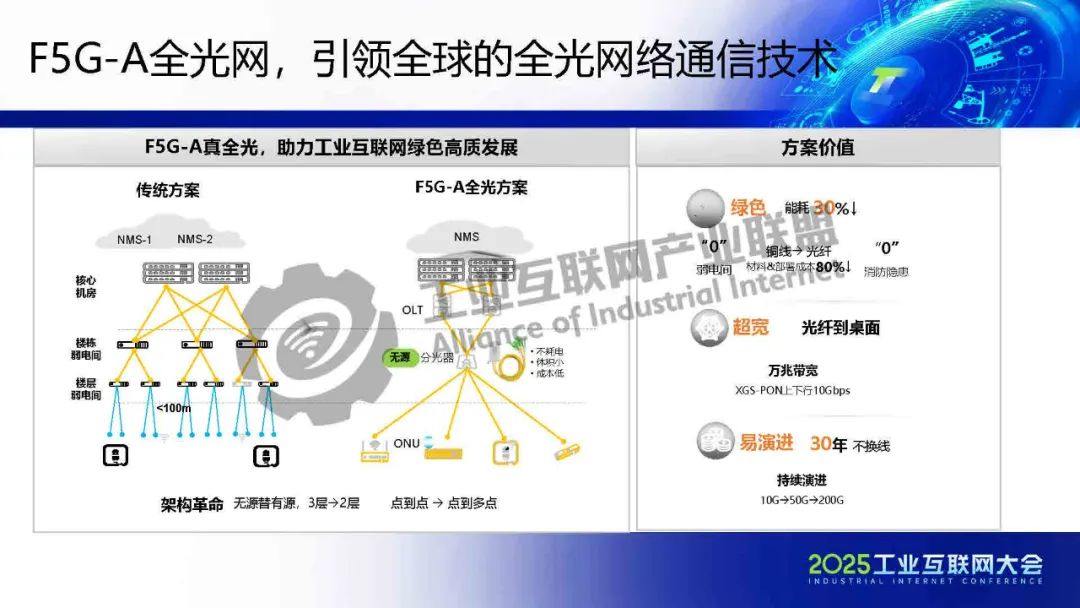 F5G-A全光網(wǎng)通過(guò)架構(gòu)革新和全光化升級(jí),為工業(yè)互聯(lián)網(wǎng)提供綠色高效的通信解決方案。相比傳統(tǒng)方案,F(xiàn)5G-A采用統(tǒng)一網(wǎng)管和光線(xiàn)路終端,實(shí)現(xiàn)三大核心優(yōu)勢(shì):一是綠色節(jié)能,能耗降低30%,以光纖替代銅線(xiàn)實(shí)現(xiàn)零電磁干擾,減少80%弱電間建設(shè)和維護(hù)成本。二是超寬性能,支持光纖到桌面的10Gbps對(duì)稱(chēng)帶寬。三是長(zhǎng)期兼容,線(xiàn)路30年無(wú)需更換并可平滑升級(jí)至200G速率。通過(guò)將網(wǎng)絡(luò)架構(gòu)從3層簡(jiǎn)化為2層、拓?fù)鋸狞c(diǎn)到點(diǎn)優(yōu)化為點(diǎn)到多點(diǎn),F(xiàn)5G-A在降低復(fù)雜度的同時(shí)提升了傳輸效率,為工業(yè)數(shù)字化轉(zhuǎn)型提供了高帶寬、低時(shí)延、可持續(xù)的新一代網(wǎng)絡(luò)基礎(chǔ)設(shè)施。
