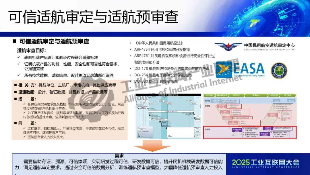 可信適航審定與適航預(yù)審查:需要借助存證、溯源、可信體系,實現(xiàn)研發(fā)過程可信、研發(fā)數(shù)據(jù)可信,提升民機機載研發(fā)數(shù)據(jù)可信能力,滿足適航審定要求。通過安全可信的數(shù)據(jù)分析,訓練適航預(yù)審查模型,大幅降低適航預(yù)審查人力投入。