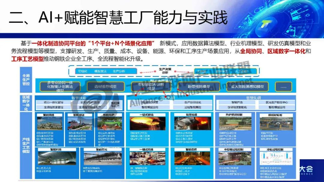 基于一體化制造協(xié)同平臺(tái)的“1個(gè)平臺(tái)+N個(gè)場(chǎng)景化應(yīng)用” 新模式,應(yīng)用數(shù)據(jù)算法模型、行業(yè)機(jī)理模型、研發(fā)仿真模型和業(yè)務(wù)流程模型等模型,支撐研發(fā)、生產(chǎn)、質(zhì)量、成本、設(shè)備、能源、環(huán)保和工序生產(chǎn)場(chǎng)景應(yīng)用,從全局協(xié)同、區(qū)域數(shù)字一體化和工序工藝模型推動(dòng)鋼鐵企業(yè)全工序、全流程智能化升級(jí)。