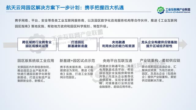 航天云網率先在四川落地工業互聯網園區平臺,服務政府、園區和入駐企業。幫助政府實現精準治理和培育、園區科學規劃、精準招商,實現企業全生命周期管理,把握跨區域跨行業的規模化運營機遇。未來,還將攜手網絡、平臺、安全等各類工業互聯網服務商,以及園區數字化咨詢服務機構等合作伙伴,推進《工業互聯網園區指南》落地實施,幫助地方政府和園區科學規劃、轉型升級。