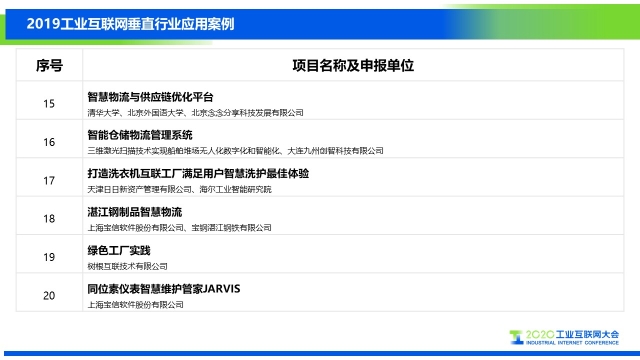 自 2019 年 10 月發布征集通知后,共收到來自 16 個企業申報的 25 個應用案例,項目包括制造與工藝管理、產品研發設計、資源配置協同、企業運營管理、生產過程管控、設備管理服務六大工業互聯網主要應用場景,覆蓋輕工家電、船舶、機械、紡織、石化、電子信息、航空航天、鋼鐵、醫療等十幾個行業領域。經評審,共遴選出 20 份具有典型示范效應案例,具體名單及詳情如下: