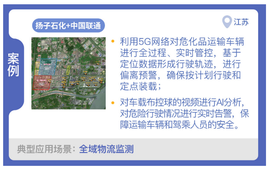 中國石化揚子石油化工有限公司與中國聯(lián)通合作,開展了“5G+安全石化”項目建設(shè),實現(xiàn)了全域物流監(jiān)測場景的應(yīng)用。利用5G+北斗技術(shù),實現(xiàn)生產(chǎn)區(qū)內(nèi)危化品車輛的高精度定位,并實時傳輸至危化品運輸管控平臺。平臺對進入揚子生產(chǎn)區(qū)的危化品車輛進行全過程、實時管控,基于定位數(shù)據(jù)形成行駛軌跡,進行偏離預警,有效保證危化品車輛按照規(guī)定路線行駛和在規(guī)定地點裝載。通過5G網(wǎng)絡(luò)將車載布控球拍攝的視頻傳輸至邊緣云平臺進行人工智能(AI)分析,對危化品車輛危險行駛、路中障礙、前車距離過近等進行實時告警,有效保障了運輸車輛和駕乘人員的安全。