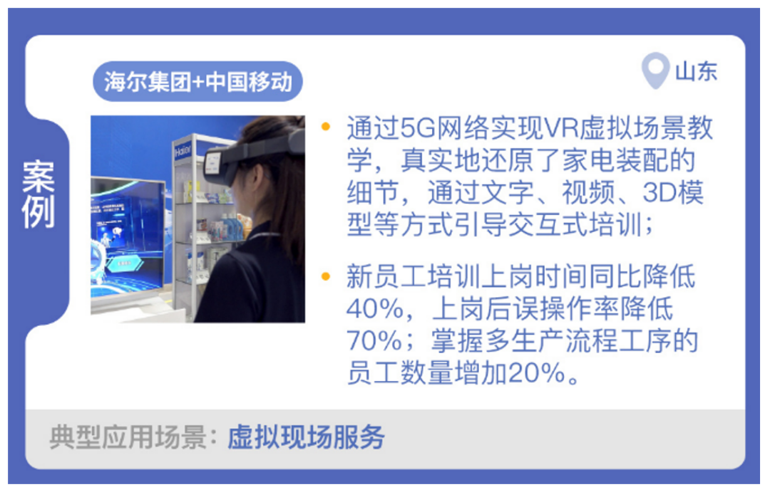 海爾集團與中國移動合作,開展了“5G全連接園區”項目建設,實現了虛擬現場服務場景的應用?;谒惴ㄉ显萍軜?,通過5G網絡實現VR內容的云端存儲。根據使用需求下載對應的VR內容用于現場教學,真實地還原了家電裝配的細節,通過文字、圖片、聲音、視頻、3D模型等方式引導交互式培訓,幫助培訓人員迅速掌握技術要領,降低了部署成本,解決了新員工培訓上崗時間周期長的問題。自海爾工廠VR員工培訓平臺投入使用以來,新員工培訓上崗時間同比降低40%,上崗后誤操作率降低70%;老員工自主學習時長增加35%,掌握多生產流程工序的產線員工數量增加20%。
