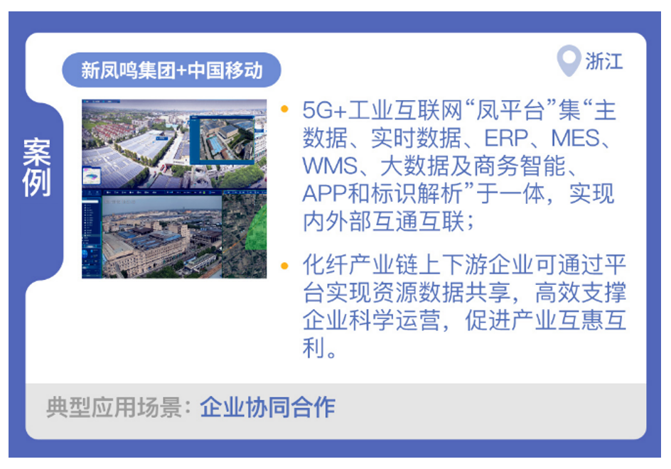 新鳳鳴集團股份有限公司與中國移動合作,搭建化纖產業5G+工業互聯網平臺“鳳平臺”,實現了企業協同合作場景的應用。平臺集“主數據、實時數據、企業資源計劃(ERP)、MES、WMS、大數據及商務智能、應用程序(APP)和標識解析”于一體,實現內外部互通互聯。通過平臺整合從市場、銷售到生產物流全環節等資源,構建靈活組織能力,實現產品配送、自提一體化管理,采、產、銷一體化分析和內外貿物流一體化運營,實時掌握化纖生產訂單及質量數據。利用5G技術和5G工業模組、工業網關、工業PLC等5G終端,貫穿化纖產業上下游,對生產環節關鍵設備實現實時監控。化纖產業鏈上下游企業可通過平臺實現資源數據共享,高效支撐企業科學運營,促進產業互惠互利。