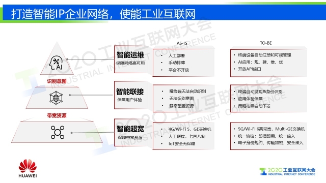 “未來的企業園區網絡應該具備三大特征,智能超寬、智能連接和智能運維。 智能超寬,對于網絡而言,這個超寬還必須有智能。以前是3G/4G、WIFI4/WIFI5,現在是5G、WIFI6,帶寬是原來的4倍以上;智能連接,以前只是連接起來,形成一個網絡,但未來的趨勢需要對園區的所有業務進行差異化;智能運維,借助于新的技術,大數據的分析以及AI,能夠把故障排查從以天/周為維度,變成按照分鐘級維度。”