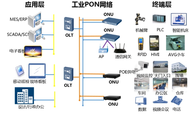 工業PON技術,適用于承載不同企業規模的離散型、流程型制造業的各類工廠內網絡業務。通過工業PON終端設備提供工業場景下的不同類型物理接口,可為工業控制、信號量監控、數據傳輸、語音通信、視頻監控、無線網絡承載等各種業務應用提供支持。