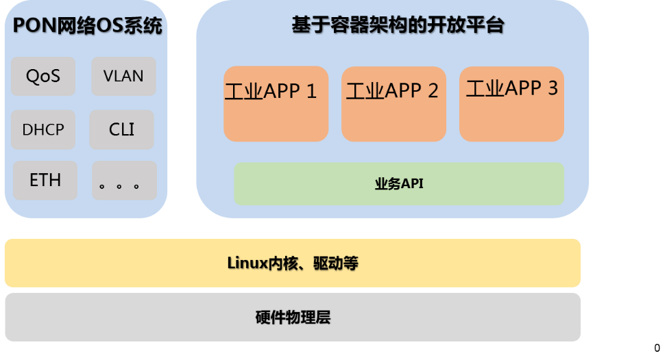 上圖所示為一種開放平臺的架構方案,該開放平臺軟件架構抽象為雙系統,包括PON網絡OS系統、數據采集功能的容器系統。雙系統運行在同一個Linux內核上。