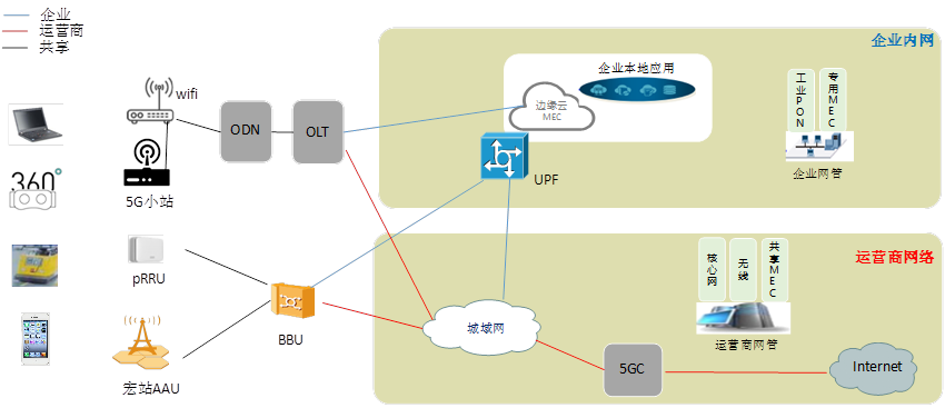 工廠內網絡可以細分為企業內網和運營商網絡。企業內網可以部署下沉UPF+MEC,起到業務分流、降低時延、數據不出廠的作用。辦公類數據可以經城域網進入運營商外網。企業內的5G無線部署可以多種方式相結合,包括宏站、皮站、室分、一體化小基站等。對于運營商外網,需要考慮如何把小基站的數據經由PON回傳后分流至5GC。對于宏站,也可以考慮采用工業PON作為回傳,只用于BBU下沉工廠內的情況,BBU如果放在電信機房,則無需通過工業PON回傳。對于企業內網,根據企業業務的不同,可能需要部署MEC,將部分WiFi、5G小基站、宏站的流量分流到工廠內部。