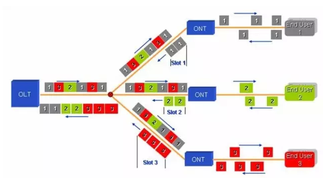 工業PON系統由局端OLT(光線路終端)、用戶端ONU(光網絡單元)、及連接局端和用戶端設備的ODN(光分配網絡)組成。整個系統采用單纖雙向、點到多點的網絡結構。下行方向(OLT到ONU),OLT發送的信號通過ODN到達各個ONU;上行方向(ONU到OLT),ONU發送的信號會到達OLT,但不會到達其他ONU。為了避免數據沖突并提高網絡利用效率,上行方向采用時分多址接入(TDMA)方式并對各ONU的數據發送進行調度。ODN由光纖和一個或者多個無源光分路器等無源光器件組成,在OLT和ONU之間提供光通道。