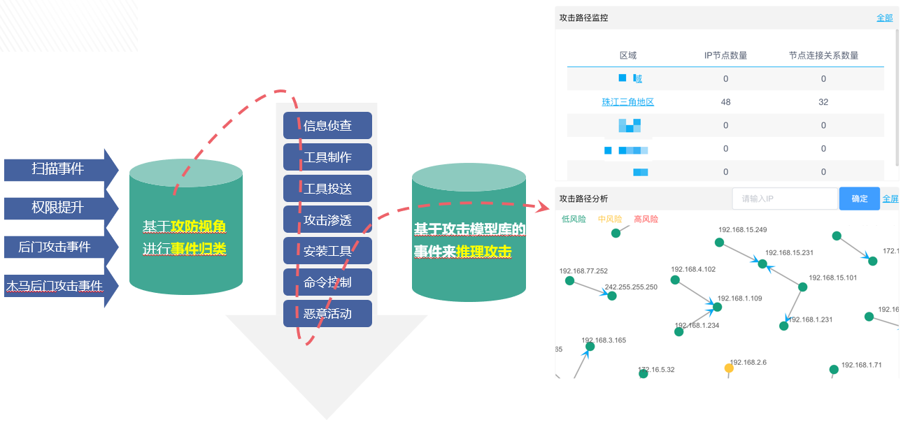 基于ATT&CK安全分析模型,對威脅事件和攻擊行為進行攻擊鏈溯源和取證,如下圖所示,通過對各類威脅事件基于攻防視角等多維度歸類,依托安全分析模型和各攻擊階段的攻擊路徑和手法進行關聯分析,為用戶還原完整的攻擊過程和攻擊影響范圍,并針對攻擊者和被攻擊者進行行為回溯和畫像。