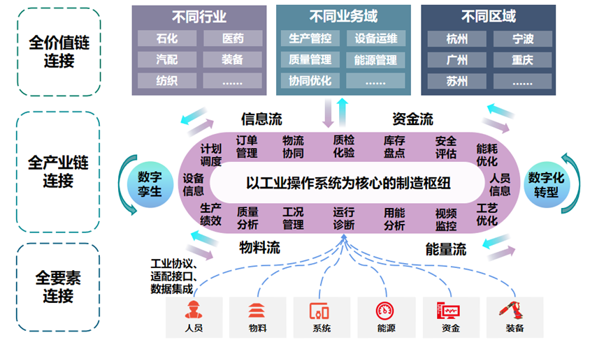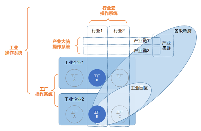 工業企業的生產與運營,需要產業上下游企業的協同支撐、受國家相關部門監管。工業企業入園、區域塊狀經濟發展、產業鏈整體提升等正在成為地方各級政府提振實體經濟的重要手段。因此,當工業操作系統面向不同產業集群、不同產業鏈進行診斷、賦能時,可發展為立體形態的產業大腦操作系統。