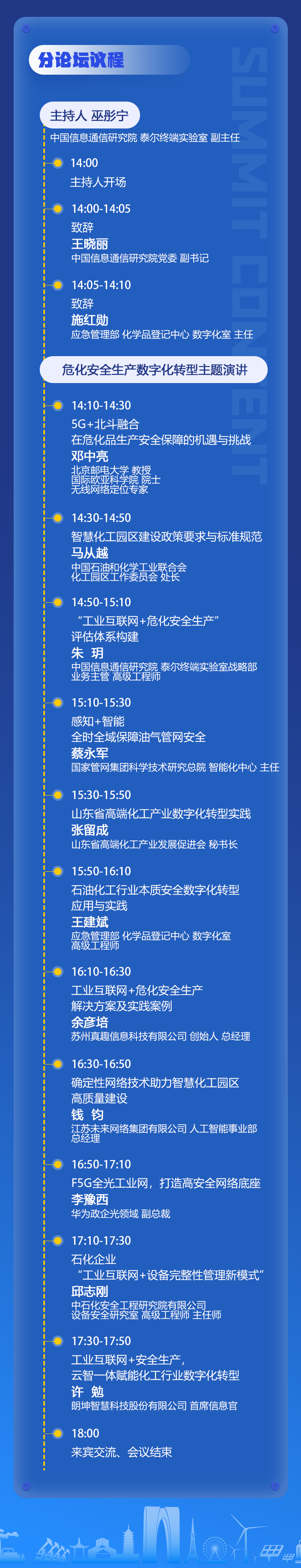 為認真貫徹落實中共中央辦公廳、國務院辦公廳《關于全面加強危險化學品安全生產工作的意見》,加快推進危險化學品安全生產信息化、智能化建設與應用工作,根據工業和信息化部、應急管理部《“工業互聯網+安全生產”行動計劃(2021-2023年)》和應急管理部《“工業互聯網+?;踩a”試點建設方案》,結合廣大危險化學品生產企業的實際需求,推動危險化學品企業實現數字化轉型、智能化升級,提高我國在危險化學品安全治理能力,擬于2023年工業互聯網大會期間,6月15日在蘇州太湖國際會議中心舉辦“工業互聯網+?;踩a數字化轉型論壇”,論壇旨在通過政策研讀、行業前瞻、成果展示、創新案例發布等形式,展示我國危險化學品生產領域安全應急產業的現狀以及發展成就,同時聚焦危化品生產領域核心技術及前沿應用,發布行業創新成果,交流經驗展望未來,助力科技成果產業化,加強政產學研用深度融合,推動?;樊a業高質量發展。 活動主題:?;踩a任重道遠,數字轉型升級大勢所趨承辦單位:中國信息通信研究院泰爾終端實驗室、山東省高端化工產業發展促進會時間地點:2023年6月15日14:00-18:00(和合廳CD)