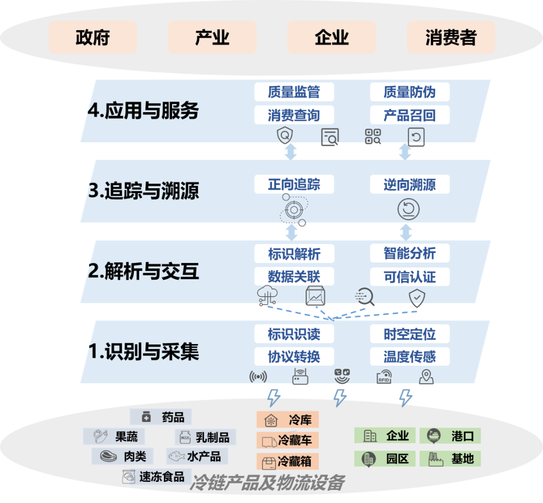 依托工業(yè)互聯(lián)網(wǎng)標識解析基礎設施,以標識解析、數(shù)據(jù)模型、主動標識載體、實時定位、區(qū)塊鏈等五大關鍵技術為支撐,提出了包含識別與采集、解析與交互、追蹤與溯源、應用與服務等在內(nèi)的四層追溯架構。通過對冷鏈物流產(chǎn)品、設備及設施等對象進行唯一標識,利用主動標識載體、時空定位等具備實時通信能力的采集設備進行關鍵環(huán)節(jié)溫控數(shù)據(jù)的可信獲取,借助標識解析的關聯(lián)交互能力實現(xiàn)標識對象的正向可追蹤和逆向可溯源,從而達到冷鏈物流全鏈條追溯的目標。
