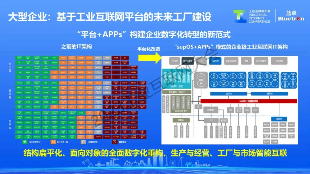 對于大型企業(yè)來講,過去二十年已經(jīng)完成了基本的自動化、信息化建設(shè),但是整個系統(tǒng)都是煙囪式的,沒有形成頂層架構(gòu),不管是數(shù)據(jù),還是數(shù)據(jù)應(yīng)用都在不斷推翻重來。通過引入supOS工業(yè)操作系統(tǒng),原本各自獨(dú)立的工業(yè)軟件變成了運(yùn)行在統(tǒng)一平臺上的工業(yè)APP。這一方式讓大型企業(yè)的結(jié)構(gòu)更加扁平化,各種業(yè)務(wù)系統(tǒng)可以有效連接,工廠和市場進(jìn)行了互聯(lián)。