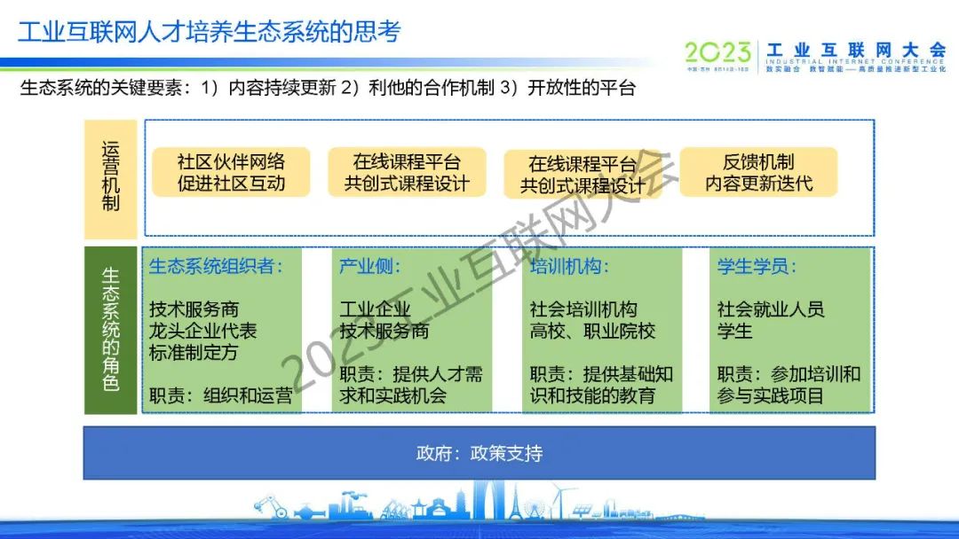 “工業互聯網人才培養生態系統的關鍵要素:1)內容持續更新2)利他的合作機制3)開放性的平臺。”