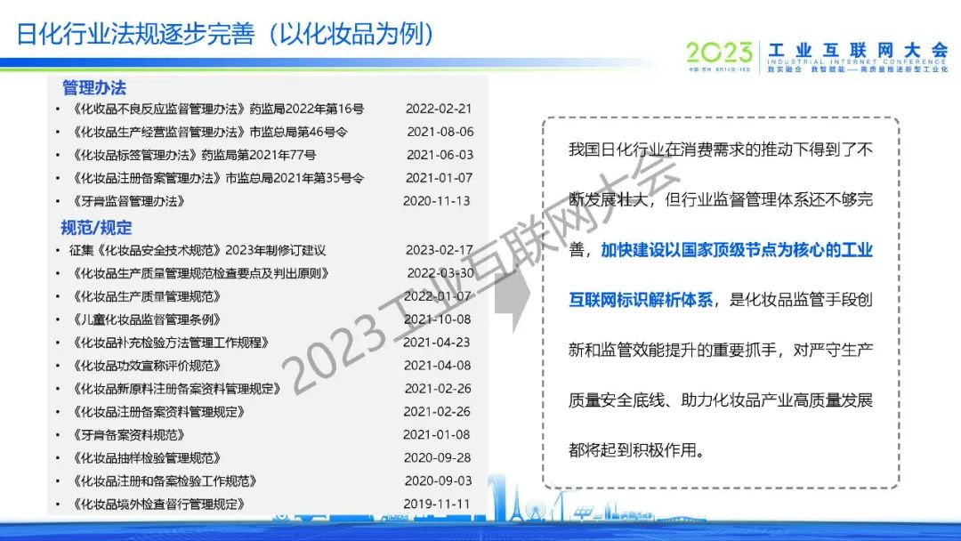 趙鵬飛表示,我國日化行業(yè)在消費需求的推動下得到了不斷發(fā)展壯大,但行業(yè)監(jiān)督管理體系還不夠完善,加快建設(shè)以國家頂級節(jié)點為核心的工業(yè)互聯(lián)網(wǎng)標(biāo)識解析體系,是日化產(chǎn)品監(jiān)管手段創(chuàng)新和監(jiān)管效能提升的重要抓手,對嚴守生產(chǎn)質(zhì)量安全底線、助力化妝品產(chǎn)業(yè)高質(zhì)量發(fā)展都將起到積極作用。