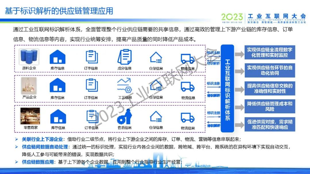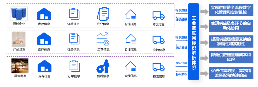 通過工業(yè)互聯(lián)網(wǎng)標(biāo)識解析體系,全面管理整個行業(yè)供應(yīng)鏈需要的共享信息,高效管理上下游產(chǎn)業(yè)鏈的庫存信息、訂單信息、物流信息等內(nèi)容,實現(xiàn)行業(yè)統(tǒng)籌安排,提高產(chǎn)品質(zhì)量的同時降低產(chǎn)品成本。實現(xiàn)行業(yè)上下游企業(yè)關(guān)聯(lián):借助行業(yè)二級節(jié)點,將行業(yè)上下游企業(yè)之間的庫存、訂單、物流、營銷等信息串聯(lián)起來;實現(xiàn)供應(yīng)鏈間數(shù)據(jù)自動處理:通過統(tǒng)一的標(biāo)識處理,行業(yè)內(nèi)各企業(yè)間的數(shù)據(jù),跨地域、跨平臺、跨系統(tǒng)的在異構(gòu)環(huán)境下實現(xiàn)自動交互,降低人工參與可能帶來的錯誤,實現(xiàn)數(shù)據(jù)共識;實現(xiàn)供應(yīng)鏈數(shù)據(jù)應(yīng)用:基于上下游各個企業(yè)數(shù)據(jù),應(yīng)用到整個行業(yè)指導(dǎo)行業(yè)生產(chǎn)經(jīng)營。