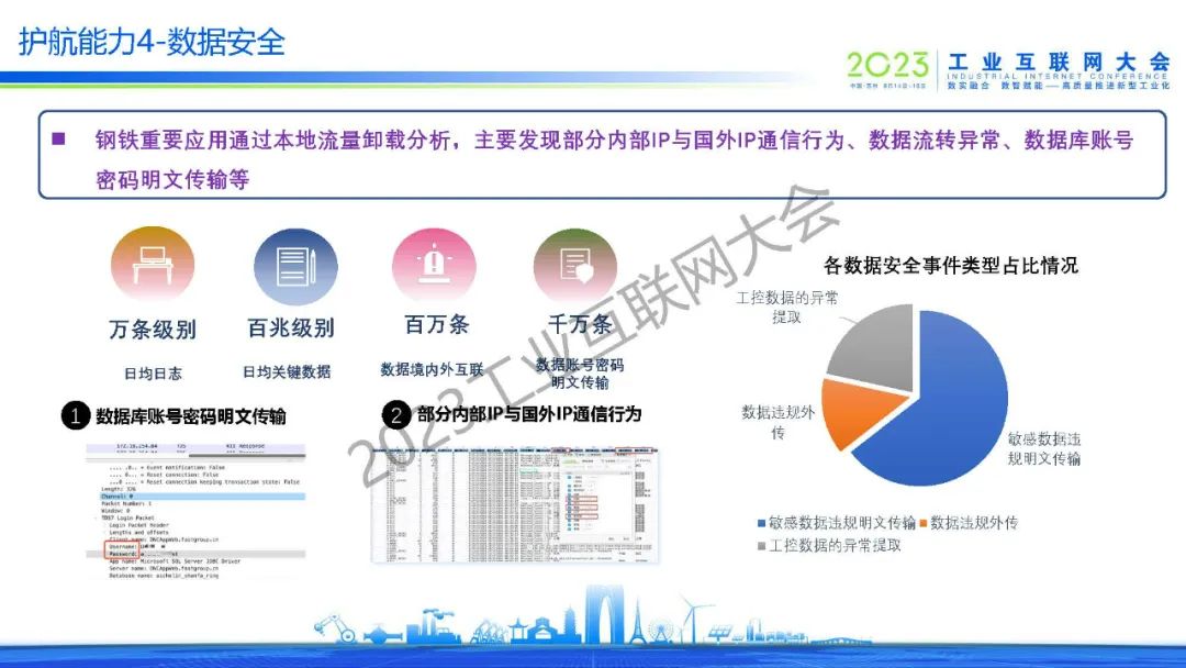 “鋼鐵重要應用通過本地流量卸載分析,主要發現部分內部IP與國外IP通信行為、數據流轉異常、數據庫賬號密碼明文傳輸等?!?/p>