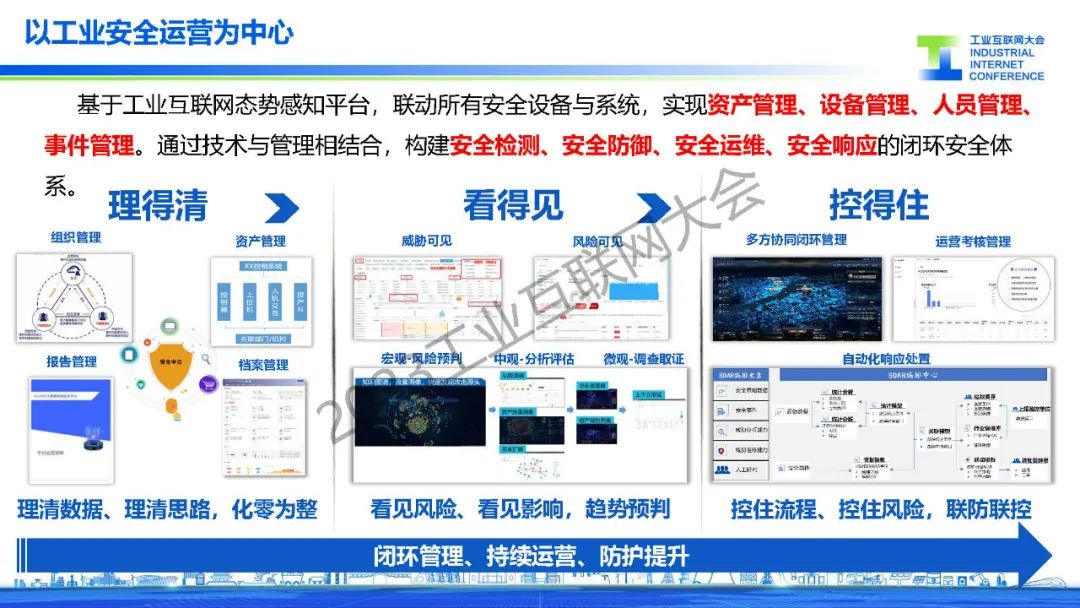 “基于工業(yè)互聯(lián)網(wǎng)態(tài)勢感知平臺,聯(lián)動所有安全設備與系統(tǒng),實現(xiàn)資產管理、設備管理、人員管理、事件管理。通過技術與管理相結合,構建安全檢測、安全防御、安全運維、安全響應的閉環(huán)安全體系?!?/p>
