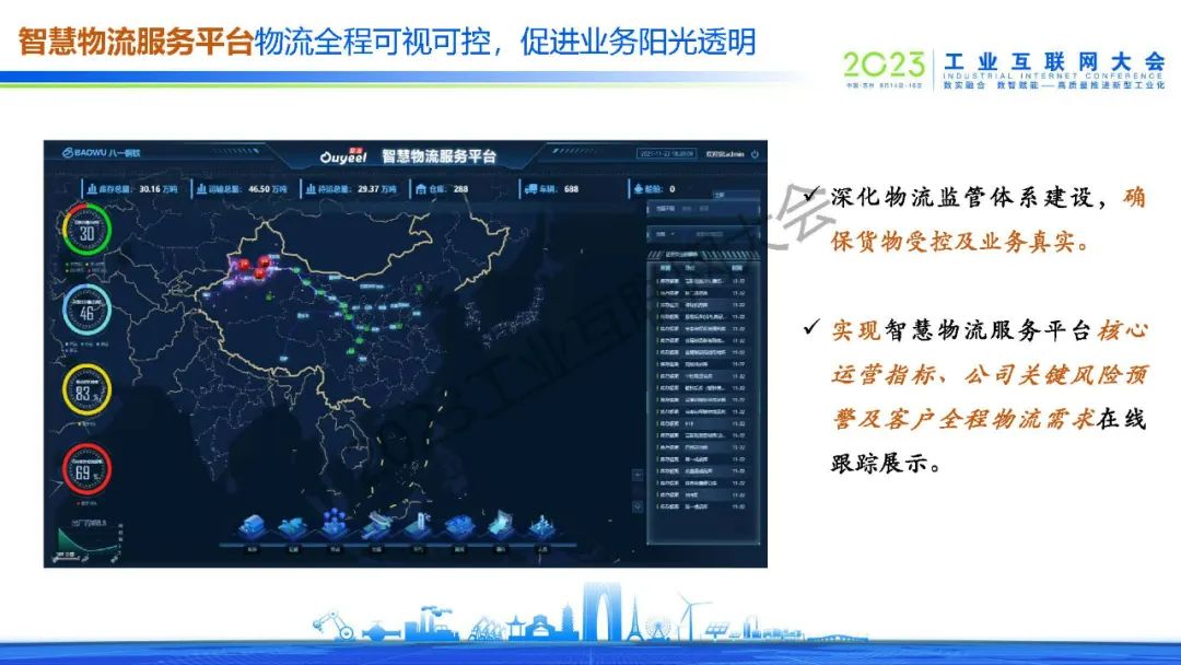 “智慧物流服務平臺可實現物流全程可視可控,促進業務陽光透明,確保貨物受控及業務真實,并實現核心運營指標、公司關鍵風險預警及客戶全程物流需求在線跟蹤展示。”