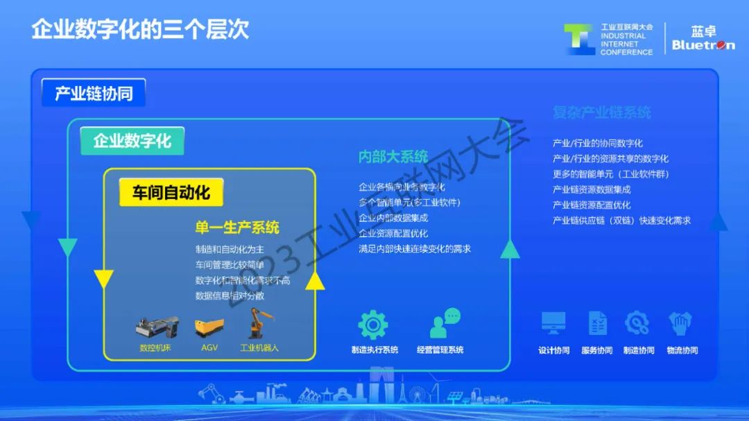 第一個層次是車間級的自動化,是企業(yè)單一的生產(chǎn)系統(tǒng),主要解決工廠產(chǎn)線設(shè)備聯(lián)網(wǎng)以及自動化制造的問題。第二個層次是企業(yè)級的數(shù)字化,主要面向企業(yè)內(nèi)部綜合的資源調(diào)度,通過互通互聯(lián)工廠生產(chǎn)、銷售、倉儲、物流等業(yè)務(wù)系統(tǒng),以實現(xiàn)企業(yè)資源的最優(yōu)配置。第三個層次涉及到產(chǎn)業(yè)鏈和供應(yīng)鏈的協(xié)同,需要從產(chǎn)業(yè)和行業(yè)的角度做協(xié)同和資源共享。幫助企業(yè)快速響應(yīng)上下游市場需求變化,以實現(xiàn)柔性制造。