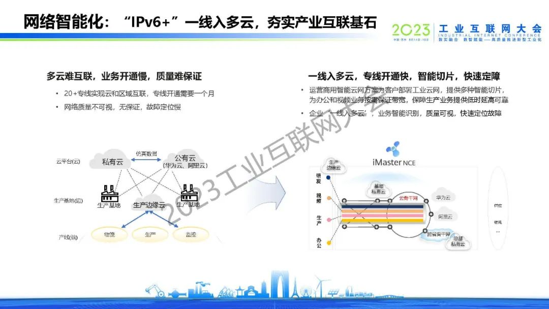 “運營商用智能云網方案為客戶部署工業云網,提供多種智能切片,為辦公和視頻業務按需保證帶寬,保障生產業務提供低時延高可靠?!?/p>