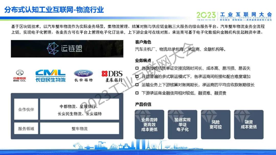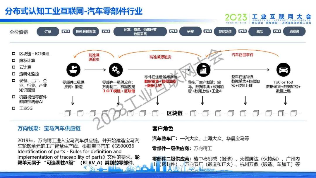 孫振華指出,分布式認知工業(yè)互聯(lián)網(wǎng)首次將區(qū)塊鏈、隱私計算、知識圖譜技術(shù)應(yīng)用到工業(yè)互聯(lián)網(wǎng)平臺。并分享了分布式認知工業(yè)互聯(lián)網(wǎng)在汽車零部件行業(yè)、鋼鐵行業(yè)、油氣數(shù)字監(jiān)管平臺、物流行業(yè)和產(chǎn)業(yè)大腦的相關(guān)應(yīng)用。