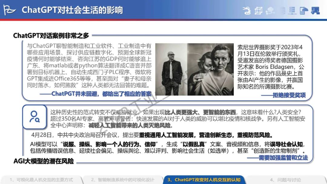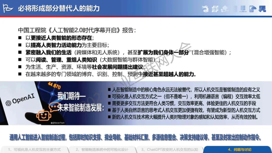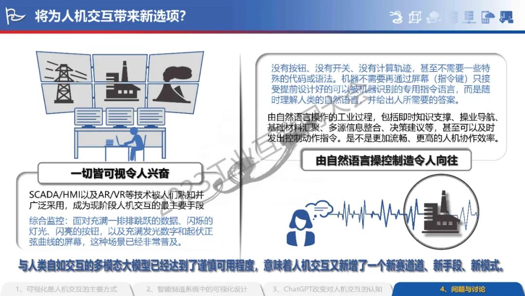 他表示,目前的人機交互功能都是遵循機器語言設計,這不僅技術門檻高,且效率低下。需要開發其他技術滿足需求。與人類自如交互的多模態大模型已經達到了謹慎可用程度,意味著人機交互又新增了一個新賽道道、新手段、新模式。通用人工智能進入智能制造過程,包括即時知識支撐、操業導航、基礎材料匯聚、多源信息整合、決策支持建議等,甚至及時發出控制動作指令。