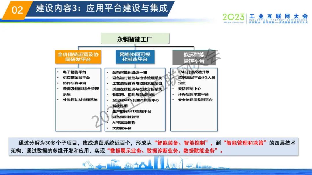 黃偉表示傳統(tǒng)的大體量、粗放式、弱研發(fā)、輕環(huán)保的管理模式,讓普通鋼鐵企業(yè)難以滿足市場(chǎng)需求,經(jīng)濟(jì)效益低,難以產(chǎn)生積極性,特種鋼材行業(yè)發(fā)展陷入困局,嚴(yán)重制約國(guó)內(nèi)高端制造業(yè)的發(fā)展。永鋼智能工廠通過(guò)分解為30多個(gè)子項(xiàng)目,集成遺留系統(tǒng)近百個(gè),形成從“智能裝備、智能控制”,到“智能管理和決策”的四層技術(shù)架構(gòu),通過(guò)數(shù)據(jù)的多維開(kāi)發(fā)和應(yīng)用,實(shí)現(xiàn)“數(shù)據(jù)展示業(yè)務(wù)、數(shù)據(jù)診斷業(yè)務(wù)、數(shù)據(jù)賦能業(yè)務(wù)”。